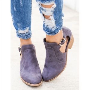 Super cute and comfy! Faux Suede. 2 inch heel and Cut Out side Buckle detail. I am between an 8/8.5 and I went with the 8! Actual color is shown in last photos. They are more of a gray hue than the purple hue in the model pics!