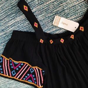 Super cute black peekaboo cold shoulder blouse with neon colored aztec - style embroidery around the sleeves, neckline, and straps.