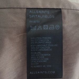 AllSaints convertible trench coat jacket, may be worn cropped. Zips off at the waist. Labeled size 10, but measurements differ. 18” pit to pit measured flat. 23” length shoulder to hem. 25” sleeves. 15.5” shoulders measured across the back. This is quite fitted through the shoulders. Should fit US 4, or UK 6. 70% cotton 30% nylon outer. Cotton lining in the body, viscose lining in the sleeves. Discoloration in the lining,not visible during wear. Freshly cleaned. Pre-loved good condition.