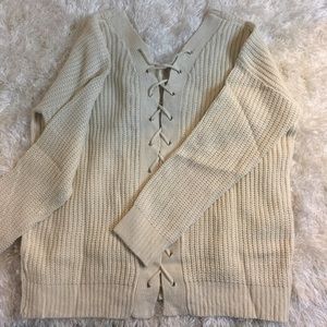 Super cute on with right amount of warmth . Oversized Lace up back detail sweater in cream color Can be worn with leggings/jeans/skirts/over dresses for laying . Cotton/polyester blend. Pullover design. Loose fit . Model is wearing size small 5’3”. Offers welcome
