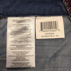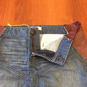 NWOT BCBG Aegean Blue faux leather side patches denim skirt. Front zipper closure with button, 2 functional back pockets. Straight, fitted waist. Size is listed as Euro 24 (size 00). Runs slightly big for a 00.