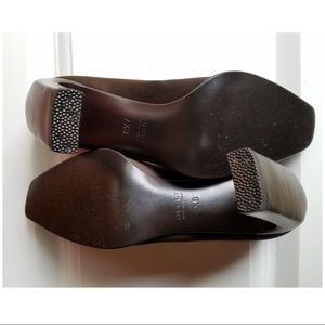Dark brown satin in used good condition, they have some scratches mostly on the toes. Tips of the heels have been replaced. No box or dust bag. Very nice color for fall and winter! Size 7 1/2 B with 4" heels.