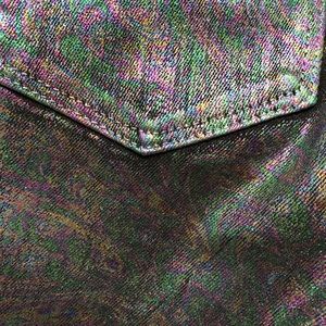 The black denim underneath the Petrol coating peeks through in some spots, which was intended by the manufacturer. Slight stretch, but the coating gives a stiff feeling.