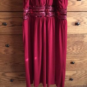 Turn heads in this stunning red strapless dress! It ties around the neck in the back and features sequins around the waist area for added visual effect. Measures 40" from shoulder to hem. Bust 19”. Excellent condition! Perfect for holiday parties!! ❤️❤️
