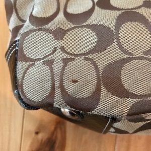 Iconic, pre-loved Coach handbag. Brown with the signature C's. Numerous compartments for optimal storage. Pretty lavender shade inside. Please refer to photos for small spots on outside of bag and inside including a few pen marks/lines. So much life left! Can't get more classic than this