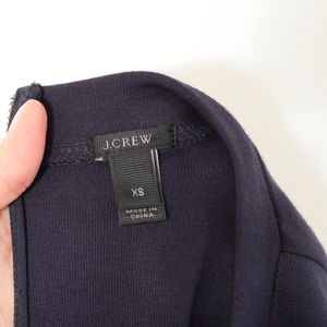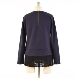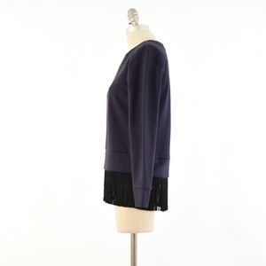 Thick, ponte knit sweatshirt from J.Crew. Dark navy with black, silky fringe at the hem. Cotton blend, some stretch. Boxy fit. Size XS, fits slightly oversized and can fit a S as well.