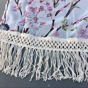 Gorgeous NWT kimono of lovely fabric floral pattern and quality. The colors are so pretty! Made of soft, light, semi-sheer blend of 95% polyester/ 5% spandex. Machine or hand wash. Hang dry. Lovely 4” beige fringe design around the entire bottom of kimono and 3/4 sleeves. Super versatile. Wear with jeans or skirt, over a basic dress, or as a bikini coverup. True to fit. Feel free to ask questions. White blouse not included. We ship fast, offer bundle discounts, and include a FREE gift! T12 H9