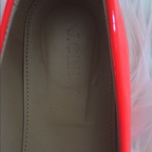 The color is neon persimmon a bright orange red color. I wore these once, only flaw is a slight discoloration the size of a pencil eraser (second picture) lol. Other than that they're great! Very well made, quality patent leather shoe.