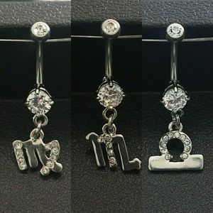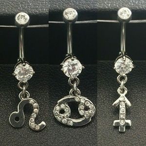 This is for 12, brand new, surgical stainless steel, astrological zodiac sign navel rings. They feature clear prong set gemstones and clear gemstones on the dangling astrological signs.
