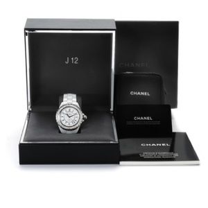 stunning white ceramic CHANEL watch with diamonds around the face. Note when comparing prices with other J12 Chanel watches that this is the watch with 2 rows of diamonds around the face. Amazing condition, no scuffs, scratches or stones missing.