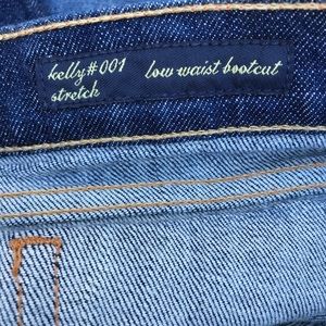 A pair of preloved dark denim with a small distressed blemish on the back of the right leg. The jeans are a kelly low waist boot cut. The inseam is 29in the waist is 28in.