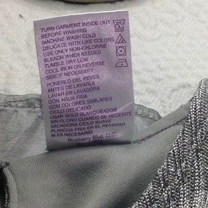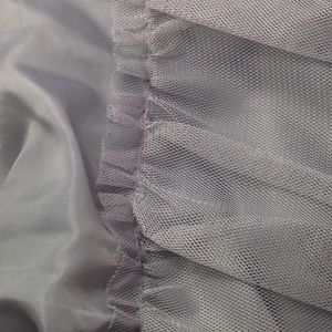 This sparkly dress is made of silver crinkle taffeta with a lined metallic bodice. Fully lined and has a tulle under ruffle. Gently elasticized waist and button neckline close. Very Pretty!