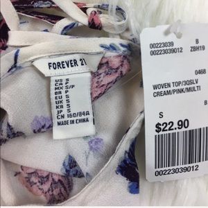 NWT flowy Floral Blouse from Forever 21. Light & airy. Crochet knit down front & on bell sleeves. Key hole Tassel tie back. 100% Rayon. Slightly sheer. Off white with pink, Blue & purple floral design. Size small. Measurements: armpit to armpit 18.5”, length 21.5”, sleeve length from shoulder 17.5”. Offers & bundles welcome.