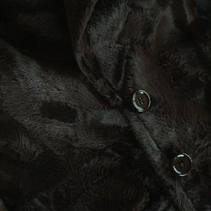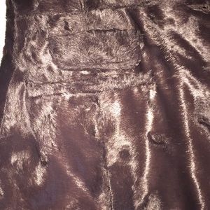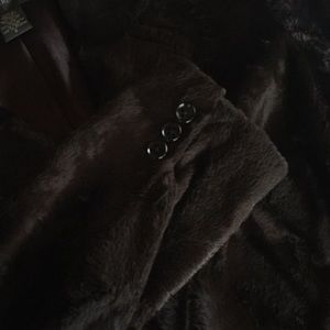 Banana Republic faux fur blazer style jacket. Notch collar - single breasted three buttons on the front. Two side pockets in the front- one with a small flap pocket above it. See photo. Fully lined. Buttons on the end of the sleeves. Dark deep brown color. Textured fur. See lightened pix to get an idea of the texture. Size 6. Excellent like new condition.