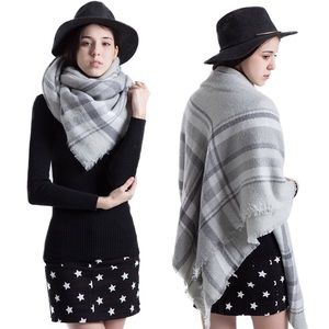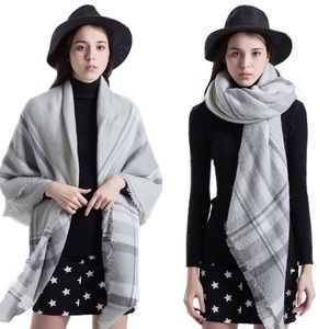 A huge, cuddly scarf perfect for sweater weather in a neutral, versatile grey color palette. Wear as a wrap, shawl, scarf, or a small throw blanket.