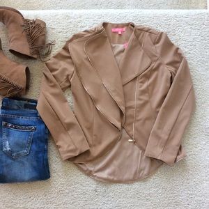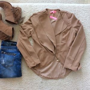 Zippered Jacket. Gorgeous caramel color Fall wardrobe staple. Can be dressed up or down. Very flattering. Long sleeves. Lined. Zippers are for effect, they are not functional.