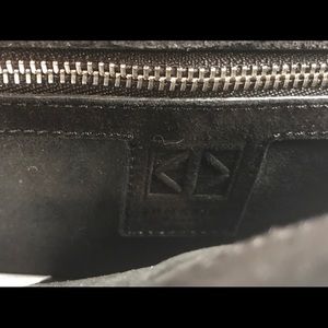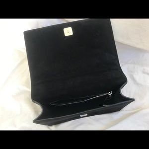 Tomasini's NWT hard to nab (especially at this price!) black suede clutch is detailed with rows of stud-embellished dimensional black suede squares and mirrored tiles. Gusseted sides. Square silver-tone metal studs This clutch and you will be the life of the party! A classic “it” bag.