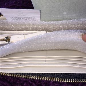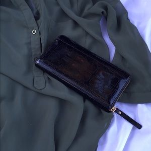 Continental wallet in patent black leather and gold hardware with delicate heart punches. It has plenty of space to fit IPhone 6 Plus, credit cards, reward cards, and cash! Great wallet