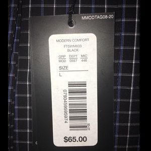 A beautiful dress shirt with a black background and blue and white plaid. Looks great as is with slacks or jeans and a blue sweater over it. This style is called modern comfort because it allows you to move more freely and comfortably than other dress shirts.