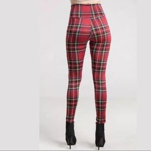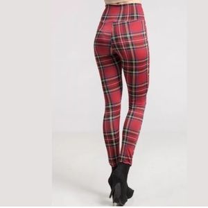 Featuring red plaid printed high waisted stretch leggings with a sexy fun cutout knee opening. Full long length. Pull on style.