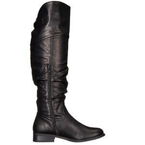 This over the knee boot sits on a 3/4 inch heel and flexible bottom. the shaft has a slight scrunch at the ankle and buckle strap detail at calf.
