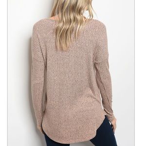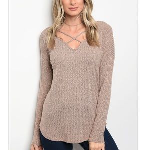 🌴DUSTY PEACH TOP FEATURES LONG SLEEVES, RELAXED FIT, V NECK WITH CRISS CROSS DETAIL, ROUNDED HEM🌴