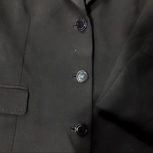 This is a black Elie Tahari fitted blazer. This awesome item has satin “tuxedo style” details on the collar, and features modern mirrored styled buttons. The cuffs of the blazer’s sleeves also have a tuxedo detail. I only wore this item twice, and it’s been living in my closet and needs a new home! The blazer is very flattering, and has a stretch fabric for the best fit.