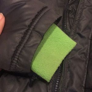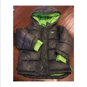 Warm and cozy puffer jacket for your toddler size 3T. In great condition. Dark gray outside with green fleece on inside. Perfect for snow or cold winter months. Fits true to size