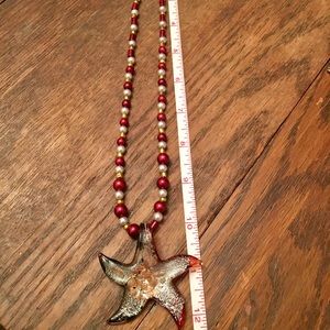 Handmade necklace featuring a colorful and sparkling glass starfish pendant. Perfect piece for your beach outfits. Lobster clasp. Note: Clasp is made of mixed metal and it is unknown if it contains nickel. Please be aware if you have any metal allergies.