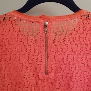 Beautiful coral long sleeve lace top from Rebecca Minkoff in a size extra small.   85% cotton and 35% nylon.  This top has a sewn in underlay in the front and lace in the back and sleeves.  Zipper closure in back.  This top measures 18 inches from the top of shoulder to the bottom and 16 inches from armpit to armpit.   Top is a true extra small.  Brand new without tags.