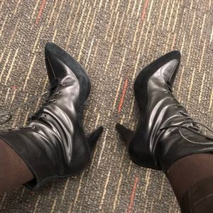 Beautiful Black leather tie ups trimmed in suede. 4’ heels. Asymmetric cut is on the top trim. Leather signature soles. Leather lining. Sexy stylish & comfy Italian made boots.