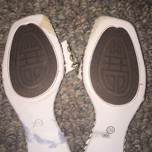 These sandals are so cute - great condition- flaws are shown in pictures which are not visible when worn- size is 36 but I am a 7 and they still fit so size 6-6.5 should be fine - heel is very small and very easy to walk with