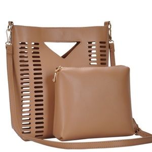 This gorgeous vegan leather laser cut handbag converts easily from a crossbody into a handheld clutch.