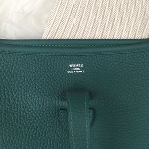 Brand new Hermes Evelyne PM III in Malachite color. Hermes shoulder bag in taurillon Clemence leather