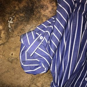 NWT! Adorable blue, off the shoulder with adjustable strap, dress with white stripes. You can fold up the arms and button them or leave them down. You can also tie it around your waist or simply take it off. Great as a dress for dinner or as a beach cover up!