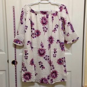 Model is approximately 5'8". Relaxed fit through body. Dress hits above knee. SIze: S, Color: White Floral, Materials: shell-100% viscose rayon, lining-100% polyester. Machine wash.
