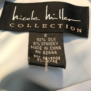 Sleeveless, fully lined, 92% silk / 8% spandex dress with hidden zipper for closure. Cut-out detail in the back. New with tags, never worn. Purchased at the Nicole Miller store in Chicago. Powder blue/green color. Shoulder to hem is 40 inches.