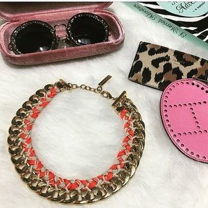 Authentic Vince Camuto necklace. Gold toned chain with a coral and tan braid weaved through the inner side of the necklace. Adjustable closure. Collar style fits close to your neck. (MH71EG)
