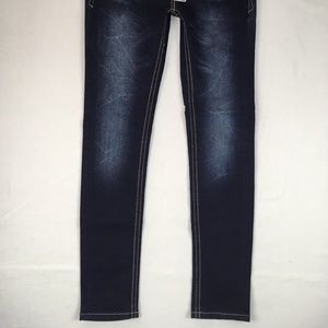 MID RISE, EASY SKINNY JEAN, CURVY FIT, SLIGHTLY EASED THROUGH HIP AND THIGH, 67% COTTON, 32% POLYESTER, 1% ELASTANE, DARK BLUE COLOR, RHINESTONE EMBROIDERED BACK POCKETS, HAND SANDING GRINDING, ZIP FLY, ONE BUTTON WAIST CLOSURE
