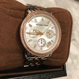 MK Gold with silver band, the band has been sized very small so it is for a small wrist only. The person I got this watch from did not send the extra links. The watch is in perfect condition, except for missing links. Like I said, it is for a small wrist only. OFFERS WELCOME, but priced According to no extra links