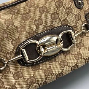 This Gucci Boston Bag is made of classic Gucci logo fabric and brown leather. It has double handles (they do have some signs of wear (rubs)) zip-top closure, bamboo ornament zipper pulls, and Gucci Horsebit Catena detail. Gold-tone studs and hardware, bottom feet, and brown fabric interior with inside zip pocket and small wall drop pocket. Some rubs on leather. Nothing a little brown polish can’t fix!!