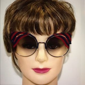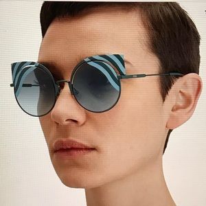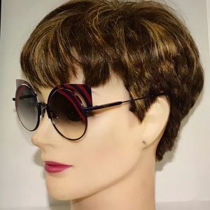 Fendi Hypnoshine Striped cutout Sunglasses, Metal sunglasses with striped detail. Round gradient lances. Cutout inset at peaked frame front. Logo script at temples. Caped ear pieces. 100% UVA/UVB protection. From 2017 collection. Made in Italy 🇮🇹