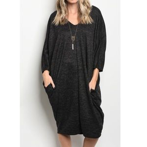 Charcoal black soft brush rayon/poly/spandex knit loose fit long sleeves side pocket dress measurements bust laying flat on one side S 34 M 35 L 36 XL 37 length S 44 M 45 L 46 XL 46