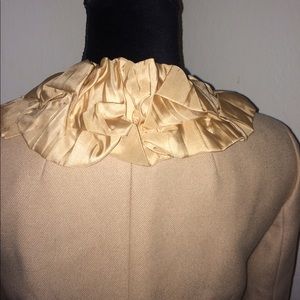 For sale: J.Crew Women's Ruffle Wool Blush Pink Blazer Jacket Fancy Silk Ruffled Trim. Sz 6. The v-neck jacket features a hook and eye closure and vertical seams for a slimming effect. Dimensions, pit to pit: approximately 16". Length: approximately 21".