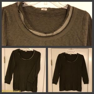 Super cute top by J. Crew with frayed, ribbon trimmed, scoop neck collar. 3/4 sleeves, stylish look, only worn a few times so EUC, but I love it! Only have too many tops and stuff in my closet.