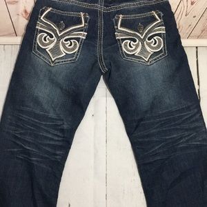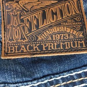Affliction destruction detail on front & reinforced stitch panels behind. Straight leg design, embroidered pockets & wide waist band w/ Black Premium logo. Dark blue Frisco Wash, button closure & hidden zipper fly. 2 front pockets w/ rivets & multiple stitch applications. Smaller pocket on the right. Side Multi color stitch darts. Whiskered, destruction & decorative seams/stitching (front & rear). 2 back pockets w/ faux flaps, fleur designs, rivets & custom hardware. 87 % Cotton, 13 % Polyester