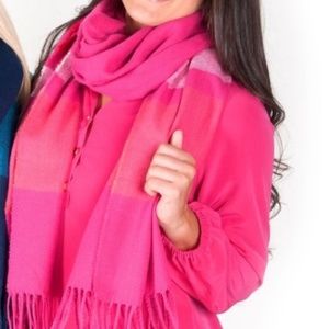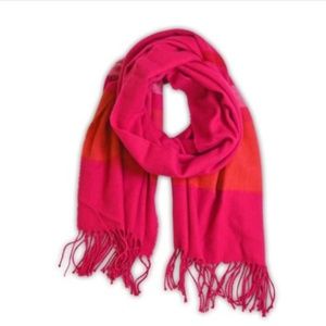 This comfy scarf with fringe ends and wide stripes is sure to add style and warmth to your everyday look.