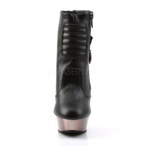 5 1/2" Finger Bone Heel, 1 1/2" Platform Gothic Moto Ankle High Heel Boots. Double Skull Buckle Straps and Studs on Heel. Pewter Chrome Plated Bottom Booties. Metal Inner Side Zipper.