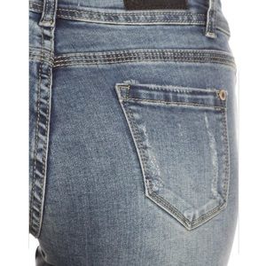 Distressed stretch skinny jeans feature a mid rise, classic 5 pocket styling, rolled cuffs, and skinny fit. 98% cotton 2% spandex. Sizing as follows: