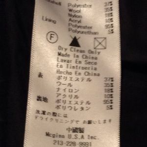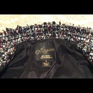 Asymmetrical Hook Closures. Ribbon Trimming with small gold chain. Elongated Jacket with Flared Back.  Metallic Thread accents.  Measurements from the top of the should to bottom of hem 24 inches; to bottom of sleeve 25 inches.